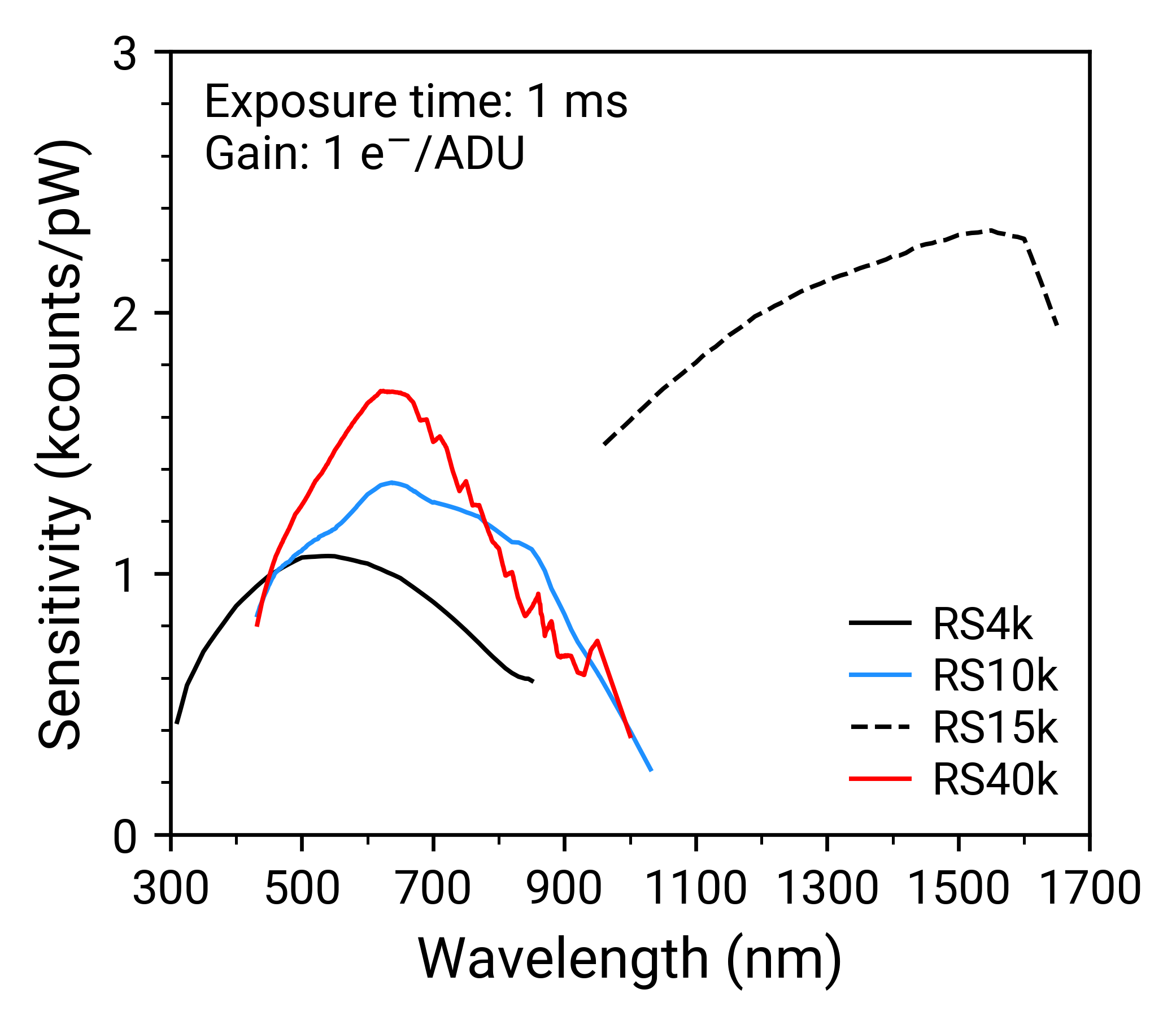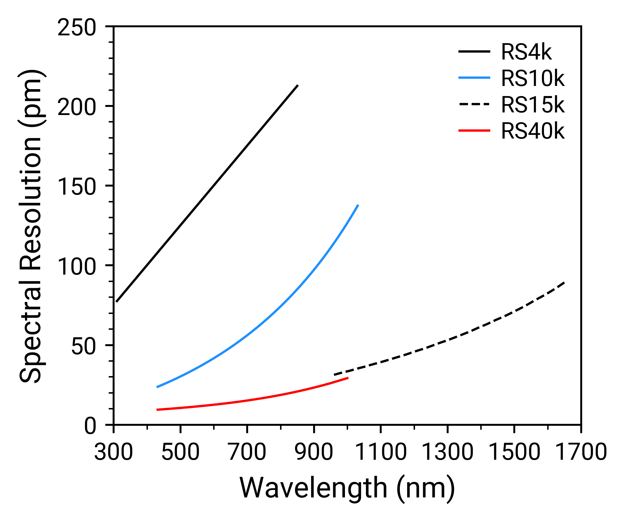 The plots below compare the RS4k, RS10k, RS15k, and RS40k spectrometers in resolution, efficiency, and sensitivity. The device efficiency includes all components of the spectrometer but does not account for fibre throughput and coupling loss.